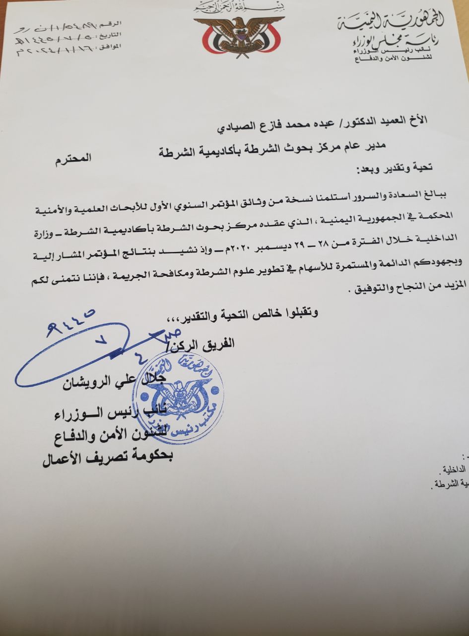 ٲشاد نائب رئيس الوزراء لشئون الٲمن والدفاع ـ الفريق ركن / جلال علي الرويشان بجهود مركز بحوث الشرطة وٲهمها اصدار نسخة ورقية من وثائق المؤتمر السنوي الٲول للٲبحاث العلمية والٲمنية المحكمة في الجمهورية اليمنية الذي عقده مركز بحوث الشرطة بٲكاديمية الشرطة ـ وزارة الداخلية خلال الفترة من 28- 29 ديسمبر 2020 بعد تسلمه نسخة منه.